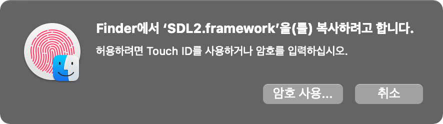 파인더에서 /Library/Frameworks로 이동한 뒤 dmg에 있는 SDL2.frameworks를 드래그앤드롭 해줍니다.