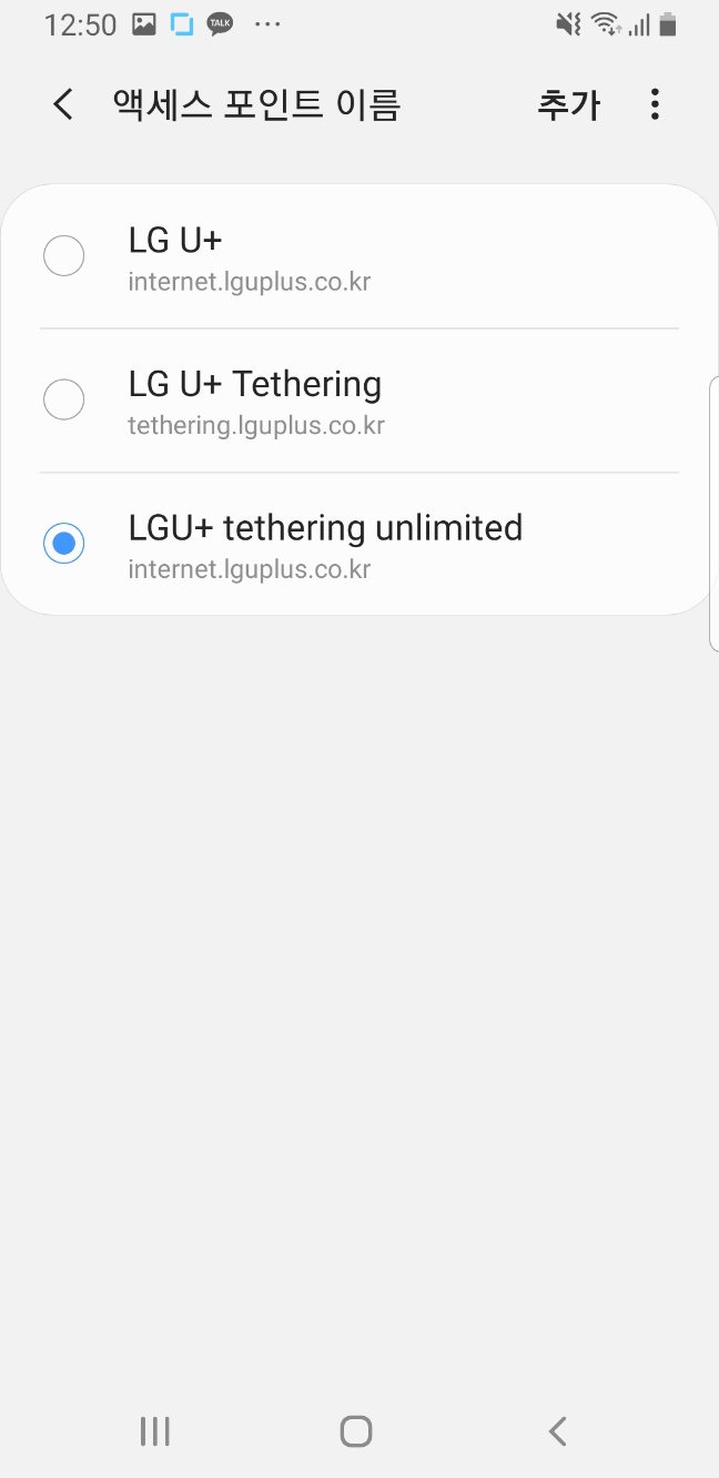 스마트폰에 유심을 넣으면 자동으로 LTE 안테나 신호가 잡히면서 전화, 문자, 인터넷을 사용할 수 있게 되는데요. 이 과정에서 가입한 통신사의 기지국으로 부터 액세스 포인트 이름 (Access Point Name, APN)을 받아오게 됩니다. APN은 스마트폰이 LTE 네트워크를 사용하기 위해서 사용할 진입점을 의미합니다. APN이 없으면 네트워크 사용이 안되서 이미 등록되어 있는 겁니다. LG U+ (LG망 사용 알뜰폰 포함)에서는 위 그림과 같이 두 개의 APN을 사용하며 주소를 보면 알수 있드시 인터넷용과 테더링(핫스팟)용이 있습니다.